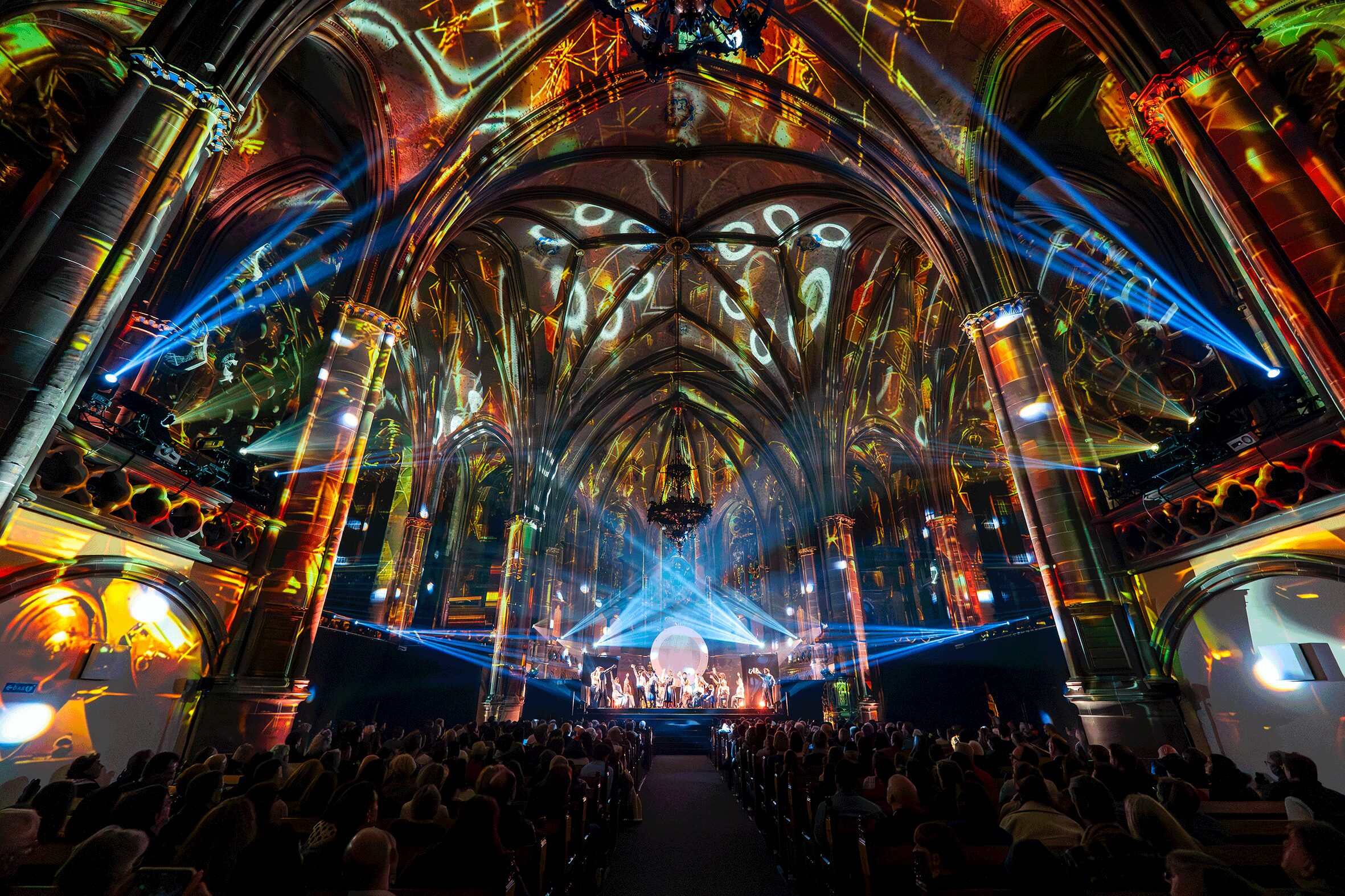 - 24 vidéoprojecteurs laser transformant l’église en un vaisseau d’images.